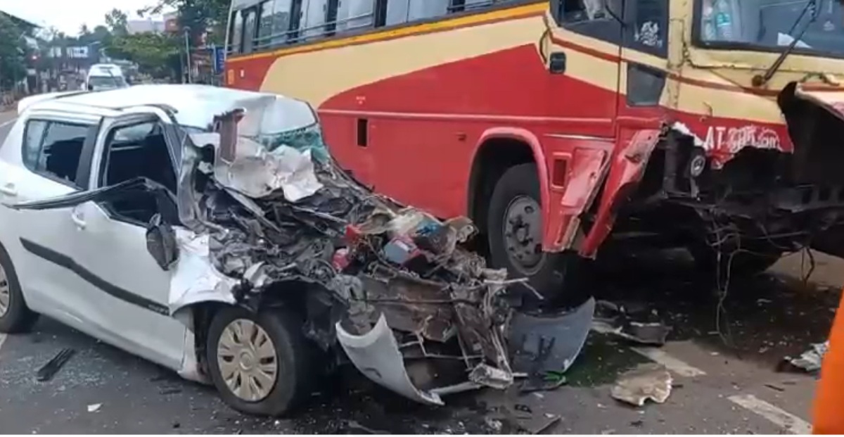 കൊട്ടാരക്കരയിലേക്ക് പോവുകയായിരുന്ന കെഎസ്ആർടിസി ബസിലേക്ക് പന്തളം ഭാഗത്തേക്ക് പോകുകയായിരുന്ന കാർ ഇടിക്കുകയായിരുന്നു. കാർ യാത്രക്കാരായ രണ്ടുപേർക്ക് പരിക്കേറ്റു. മാവേലിക്കര ഇടപ്പോൺ സ്വദേശികളായ വിഷ്ണു ,സന്ദീപ് എന്നിവർക്കാണ് പരിക്കേറ്റത്.