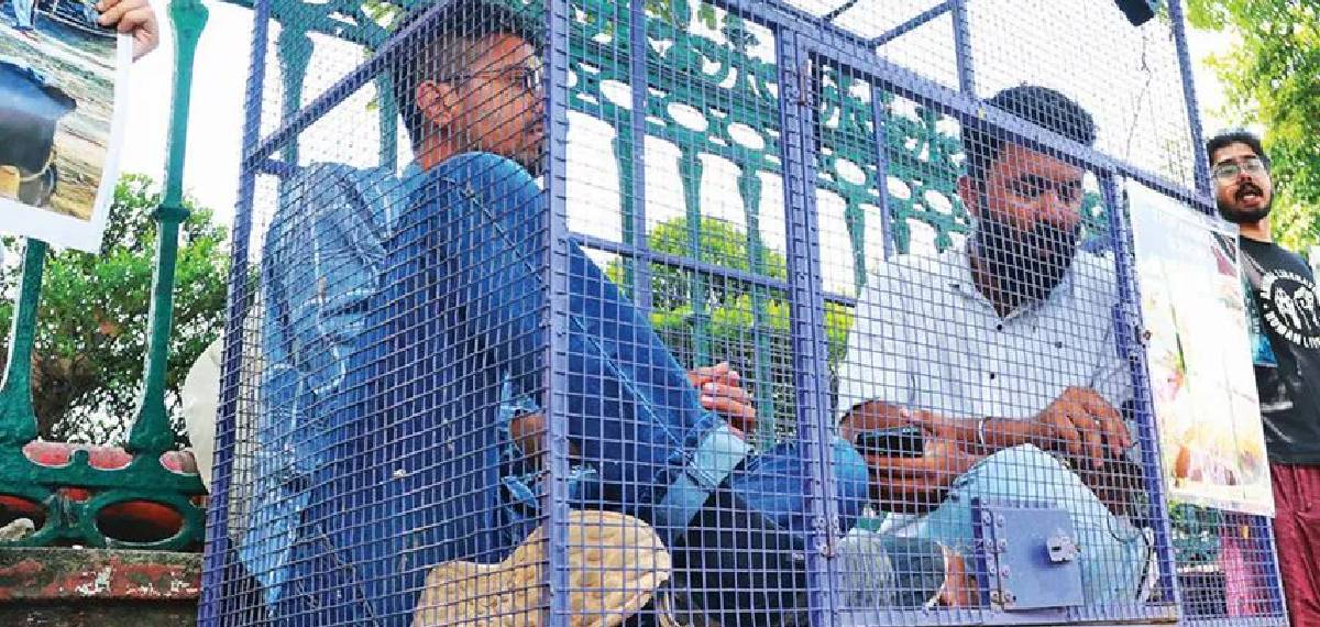 മൃഗങ്ങള്‍ക്കായി വ്യത്യസ്ത സമരം;തിരുവനന്തപുരത്ത് കൂട്ടില്‍ക്കിടന്ന് പ്രതിഷേധിച്ച് യുവാക്കള്‍