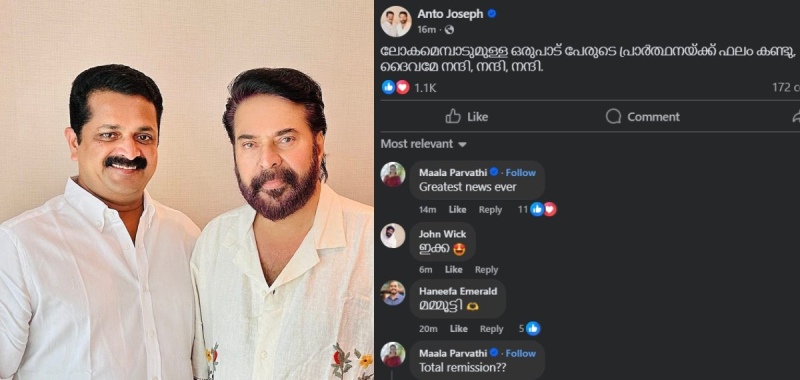 ലോകമെമ്പാടുമുള്ള ഒരുപാട് പേരുടെ പ്രാർത്ഥനയ്ക്ക് ഫലം കണ്ടെന്ന് നിർമാതാവ് ആന്റോ ജോസഫ്. ദൈവമേ നന്ദിയെന്നും ആന്റോ കൂട്ടിച്ചേർത്തു.