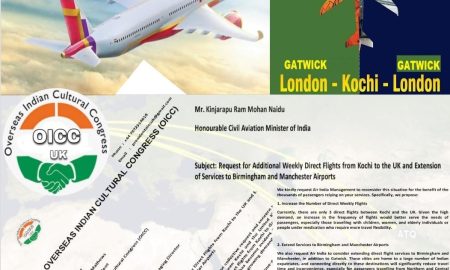 കൊച്ചി – യു കെ എയർ ഇന്ത്യയുടെ പ്രതിവാര വിമാന സർവീസുകൾ വർധിപ്പിക്കുക, സർവീസുകൾ ബിർമിങ്ങ്ഹം / മാഞ്ചസ്റ്റർ വരെ നീട്ടുക: നിവേദനം സമർപ്പിച്ച് ഒ ഐ സി സി...