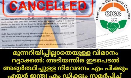 മുന്നറിയിപ്പില്ലാതെയുള്ള വിമാനം റദ്ദാക്കൽ: അടിയന്തിര ഇടപെടൽ അഭ്യർത്ഥിച്ചുള്ള നിവേദനം എം പിക്കുംഎയർ ഇന്ത്യ എം ഡിക്കും സമർപ്പിച്ച്ഒ ഐ സി സി (യു കെ) റോമി കുര്യാക്കോസ് ലണ്ടൻ: ആഗോള...