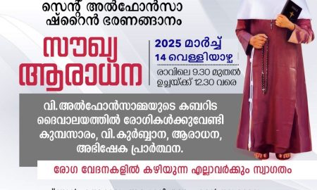 ഭരണങ്ങാനം: വി. അൽഫോൻസാ തീർത്ഥാടന കേന്ദ്രത്തിൽ ഇന്ന് (മാർച്ച് 14 വെള്ളിയാഴ്ച) രോഗീദിനമായി ആചരിക്കുന്നു. എല്ലാ മാസവും ഒരു ദിവസം രോഗികൾക്ക് വേണ്ടി പ്രത്യേക പ്രാർത്ഥനാ ശുശ്രൂഷകൾ ഭരണങ്ങാനം വിശുദ്ധ...