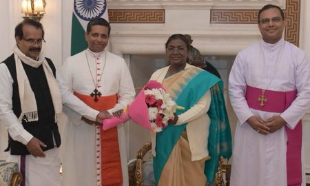 രാഷ്ട്രപതി ദ്രൗപദി മുർമുവുമായി കൂടിക്കാഴ്ച നടത്തി കേന്ദ്രമന്ത്രി ജോർജ് കുര്യൻ, കർദ്ദിനാൾ ജോർജ് ജെ കൂവക്കാട്, ആർച്ച് ബിഷപ്പ് തോമസ് തറയിൽ എന്നിവർ. രാഷ്ട്രപതി ഭവനിലെത്തിയ ഇവരെ രാഷ്ട്രപതി, ബൊക്ക...