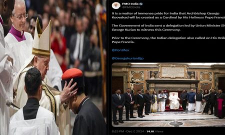 ആർച്ച്ബിഷപ് മാര് ജോര്ജ് കൂവക്കാട്ടിനെ കര്ദിനാള് പദവിയിലേക്ക് ഉയര്ത്തിയത് ഭാരതത്തിന് അഭിമാനകരമെന്ന് പ്രധാനമന്ത്രി നരേന്ദ്രമോദി. ഔദ്യോഗിക എക്സ് പേജിലാണ് പ്രധാനമന്ത്രി പോസ്റ്റ് പങ്കുവെച്ചത്. കേന്ദ്രമന്ത്രി ജോര്ജ് കുര്യന്റെ നേതൃത്വത്തിലുള്ള പ്രതിനിധി...
