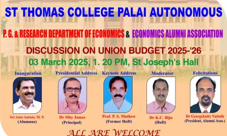 പാലാ:സെന്റ് തോമസ് കോളേജ് ഇക്കണൊമിക്സ് ബിരുദാനന്തര ബിരുദ ഗവേഷണ വിഭാഗത്തിന്റെയും അലുംനി അസോസിയേഷന്റെയും സംയുക്ത ആഭിമുഖ്യത്തിൽ കേന്ദ്ര ബജറ്റ് 2025-’26 ചർച്ചയും അവലോകനവും മാർച്ച് മൂന്നിന് നടത്തപ്പെടും. ഉച്ചക്ക് 1.20...
