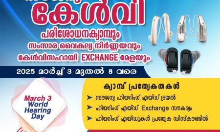 പാലാ:സൗജന്യ കേൾവി പരിശോധന ക്യാമ്പ് :മാർച്ച് 3 ലോക കേൾവി ദിനത്തോടനുബന്ധിച്ചു പാലാ ആവേ സൗണ്ട് ക്ലിനിക്കിൽ വച്ച് 2025 മാർച്ച് 3 മുതൽ 8 വരെ രാവിലെ 9:30...