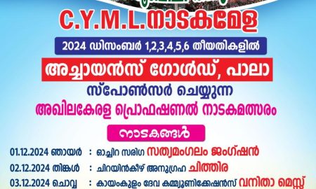 പാലാ: പാലായുടെ ദേശീയോൽസവമായ അമലോത്ഭവ ദൈവ മാതാവിൻ്റെ ജൂബിലി തിരുന്നാളിൻ്റെ ആഘോഷത്തോടനുബന്ധിച്ച് ഡിസംമ്പർ ഒന്ന് ഞായറാഴ്ച മുതൽ ഡിസംബർ ആറ് വെള്ളിയാഴ്ച വരെ സി.വൈ.എം.എല്ലിൻ്റ ആഭിമുഖ്യത്തിൽ പ്രൊഫഷണൽ നാടക...