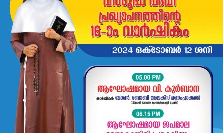 ഭരണങ്ങാനം: വി. അൽഫോൻസാ തീർത്ഥാടനകേന്ദ്രത്തിൽ ഒക്ടോബർ 12 ശനിയാഴ്ച അൽഫോൻസാമ്മയുടെ വിശുദ്ധ പദവി പ്രഖ്യാപനത്തിൻറെ 16-ാം വാർഷികം ആഘോഷിക്കുന്നു. 2008 ഒക്ടോബർ 12-ന് പരിശുദ്ധ ബനഡിക്ട് പതിനാറാമാൻ മാർപ്പാപ്പയാണ് അൽഫോൻസാമ്മയുടെ...