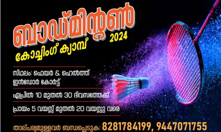പൂഞ്ഞാറിൽ ബാഡ്മിൻ്റൺ കോച്ചിംഗ് ക്യാമ്പ് നടത്തപ്പെടുന്നു. ഏപ്രിൽ 10 മുതൽ 30 ദിവസത്തേക്ക് ആണ് ക്യാമ്പ് . അഞ്ച് വയസ് മുതൽ 20 വയസ് വരെയുള്ളവർക്കാണ് ക്യാമ്പിൽ പങ്കെടുക്കാവുന്നത് –...