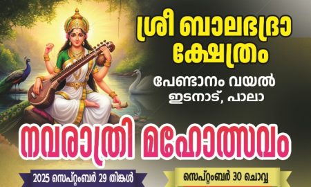 പാലാ:പേണ്ടാനം വയൽ ശ്രീബാലഭദ്രാ ക്ഷേത്രത്തിൽ നവരാത്രി മഹോത്സവത്തോടനുബന്ധിച്ചു നടക്കുന്ന വിദ്യാരംഭ പൂജകളിൽ വിജയദശമി ദിവസമായ ഒക്ടോബർ 02 വ്യാഴം രാവിലെ 5.30 മുതൽ 7 വരെ പൂജ എടുപ്പ് നടത്തുന്നു....