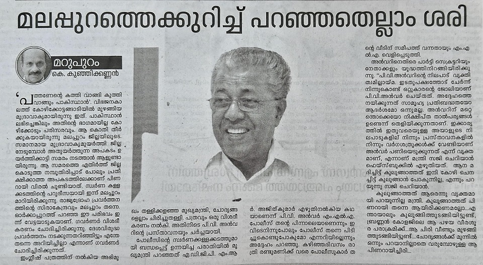 സ്വർണക്കള്ളക്കടത്തു സംബന്ധിച്ച് മലപ്പുറം ജില്ലയെക്കുറിച്ച് മുഖ്യമന്ത്രി പറഞ്ഞതെല്ലാം ശരിയാണെന്ന് ആർഎസ്എസ് മുഖപത്രം ജന്മഭൂമി. എഡിറ്റോറിയല് പേജിൽ മുതിർന്ന മാധ്യമ പ്രവർത്തകൻ കെ കുഞ്ഞിക്കണ്ണൻ എഴുതിയ ‘മലപ്പുറത്തെക്കുറിച്ച് പറഞ്ഞതെല്ലാം ശരി’ എന്ന ലേഖനത്തിലാണ് പിണറായിയുടെ നിലപാടിനെ ശരിവെച്ചത്.