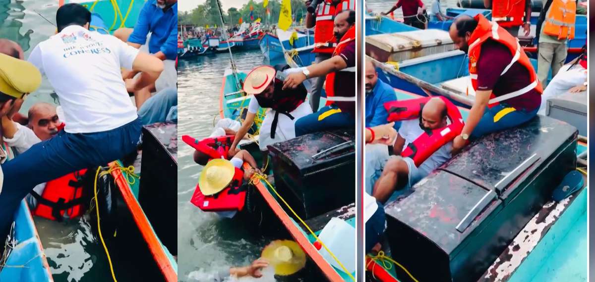 വള്ളത്തില് കയറാന് ശ്രമിക്കുന്നതിലൂടെ തെന്നി വീഴുകയായിരുന്നു. ഇന്നലെ കെ സി വേണുഗോപാല് എംപി പങ്കെടുത്ത പരിപാടിക്കിടെയാണ് സംഭവം. ആര്ക്കും പരിക്കില്ല.