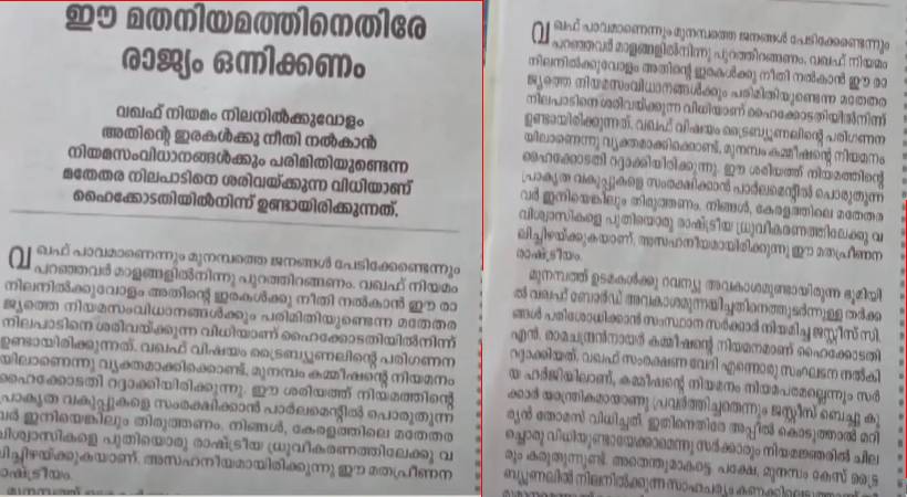 വഖഫ് മത നിയമത്തിനെതിരെ രാജ്യം ഒന്നിക്കണം. വഖഫ് നിയമം സംരക്ഷിക്കാൻ പാർലമെന്റിൽ പൊരുതുന്നവർ തിരുത്തണം. ഈ മതപ്രീണനം അസഹനീയമെന്നും ദീപിക എഡിറ്റോറിയൽ തുറന്നടിക്കുന്നു. കേരളത്തിലെ മതേതര വിശ്വാസികളെ പുതിയൊരു രാഷ്ട്രീയ ധ്രുവീകരണത്തിലേക്ക് വലിച്ചിഴയ്ക്കരുതെന്ന് മുന്നറിയിപ്പ് നൽകിയാണ് മുഖപ്രസംഗം അവസാനിക്കുന്നത്. അതേസമയം മുനമ്പം വിഷയത്തിൽ നിയമവശം പരിശോധിച്ച് സർക്കാർ നടപടി എടുക്കുമെന്ന് എൽഡിഎഫ് കൺവീനൻ ടിപി രാമകൃഷ്ണൻ പ്രതികരിച്ചു.