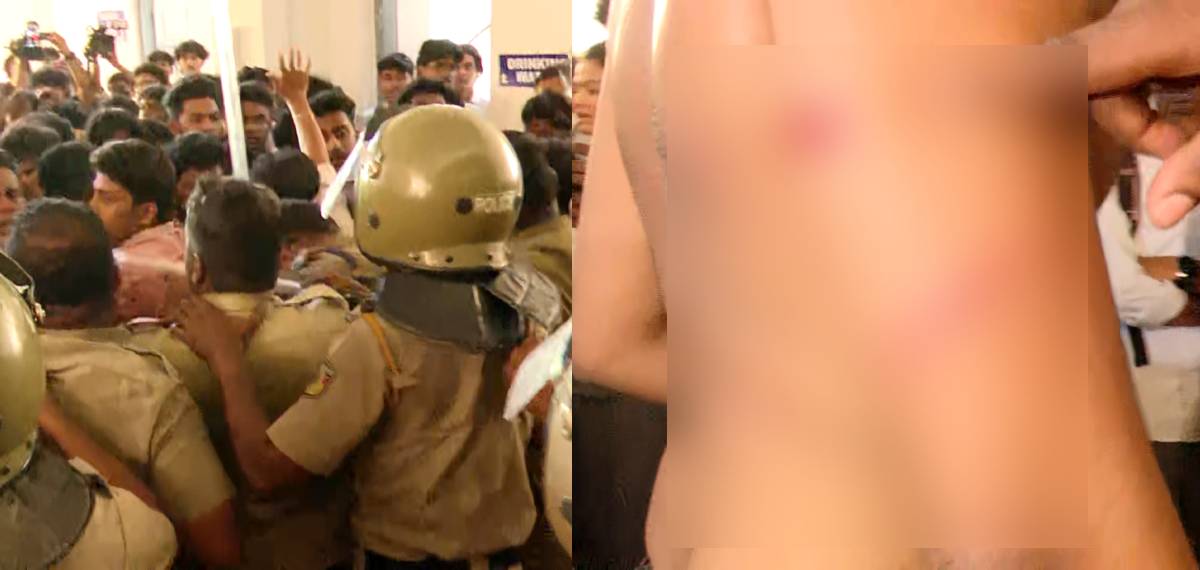 അതേസമയം കോളേജ് കവാടത്തിന് അരികെ എസ്എഫ്ഐ പ്രവര്ത്തകരെ പൊലീസ് തടഞ്ഞതോടെ പ്രവര്ത്തകരും പൊലീസും തമ്മില് ഉന്തും തള്ളുമുണ്ടായി. എസ്എഫ്ഐ പ്രവർത്തകർക്കും വിദ്യാർത്ഥികൾക്കും നേരെ പൊലീസ് ലാത്തിച്ചാർജ് നടത്തി.