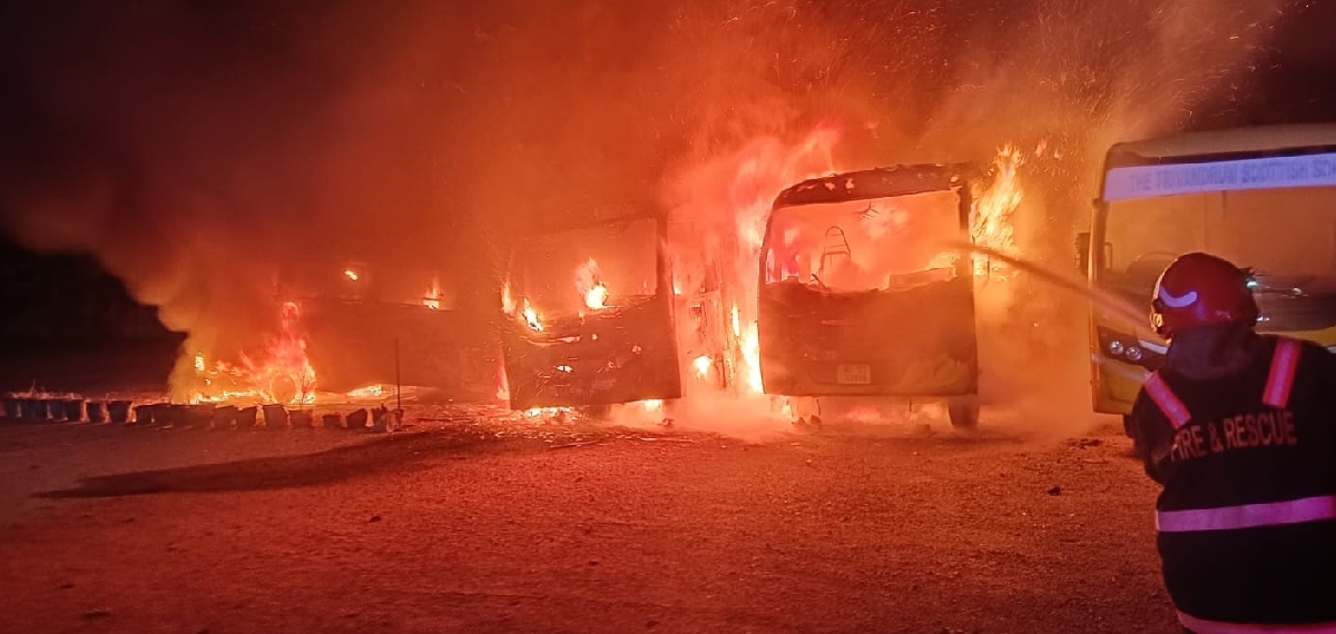 ഇന്ന് പുലര്ച്ചെ 2.45 ഓടെയാണ് സംഭവം നടന്നത്. പ്രദേശവാസികളാണ് ബസ് കത്തുന്നത് ആദ്യം കണ്ടത്. തുടര്ന്ന് ഫയര്ഫോഴ്സിനെ വിവരം അറിയിക്കുകയായിരുന്നു. ഉടന് തന്നെ കഴക്കൂട്ടം, ചാക്ക ഭാഗത്തുനിന്നുള്ള ഫയര്ഫോഴ്സ് സംഘം സ്ഥലത്തെത്തി. മണിക്കൂറുകളെടുത്താണ് തീയണച്ചത്.