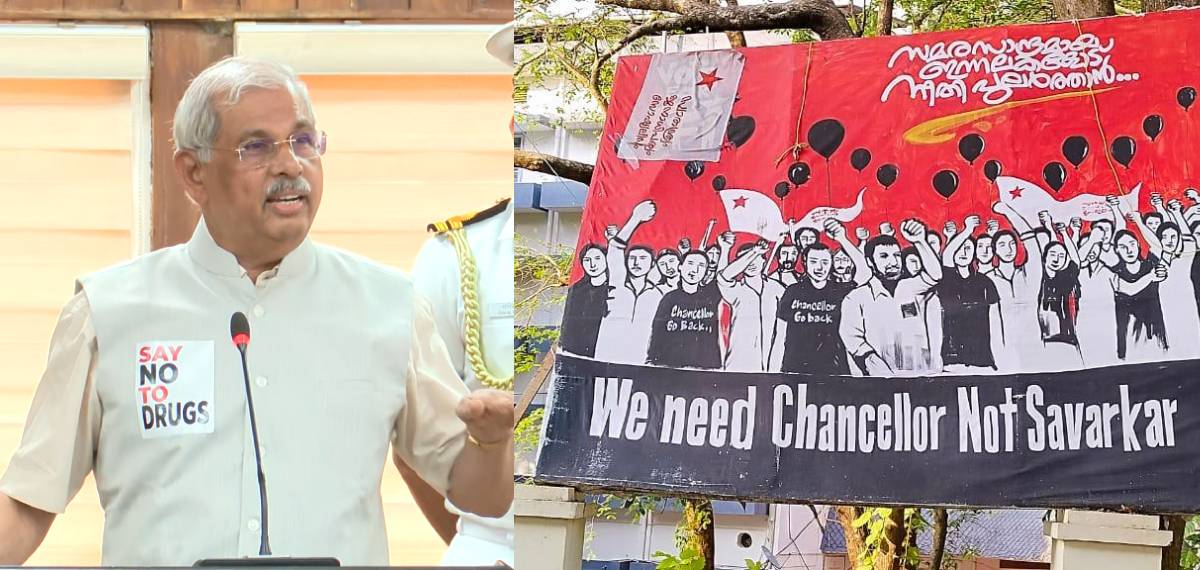 സവര്ക്കര് എങ്ങനെയാണ് രാജ്യത്തിന്റെ ശത്രു ആകുന്നതെന്ന് ഗവര്ണര് ചോദിച്ചു. സവര്ക്കര് എന്താണ് ചെയ്തതെന്നും ശരിയായി പഠിച്ചാല് കാര്യങ്ങള് മനസിലാകുമെന്നും അദ്ദേഹം പറഞ്ഞു. We need Chancellor not Savarkar എന്ന ബാനറിലാണ് ഗവര്ണറുടെ പ്രതികരണം.
