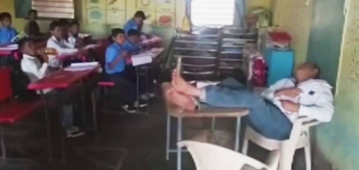 മുംബൈ: ക്ലാസ് മുറിയില് കുട്ടികള്ക്കു മുന്നില് മേശയ്ക്കുമേല് കാല് കയറ്റിവെച്ച് ഉറങ്ങി അധ്യാപകന്. മഹാരാഷ്ട്രയിലെ ഗഡേഗവന് ഗ്രാമത്തിലാണ് സംഭവം.
