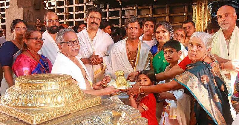 ഗുരുവായൂര് ക്ഷേത്രത്തിന് വേണ്ടി ദേവസ്വം ചെയര്മാന് ഡോ.വി കെ വിജയന് കിരീടം ഏറ്റുവാങ്ങി. അഡ്മിനിസ്ട്രേറ്റര് കെ പി വിനയന്, ക്ഷേത്രം ഡെപ്യൂട്ടി അഡ്മിനിസ്ട്രേറ്റര് പ്രമോദ് കളരിക്കല്, ക്ഷേത്രം അസി.മാനേജര്മാരായ കെ രാമകൃഷ്ണന്, കെ കെസുഭാഷ്, സി ആര് ലെജുമോള് ,കുലോത്തുംഗന്റെ ഭാര്യ രേണുകാദേവി, മക്കള് എന്നിവര് സന്നിഹിതരായി.