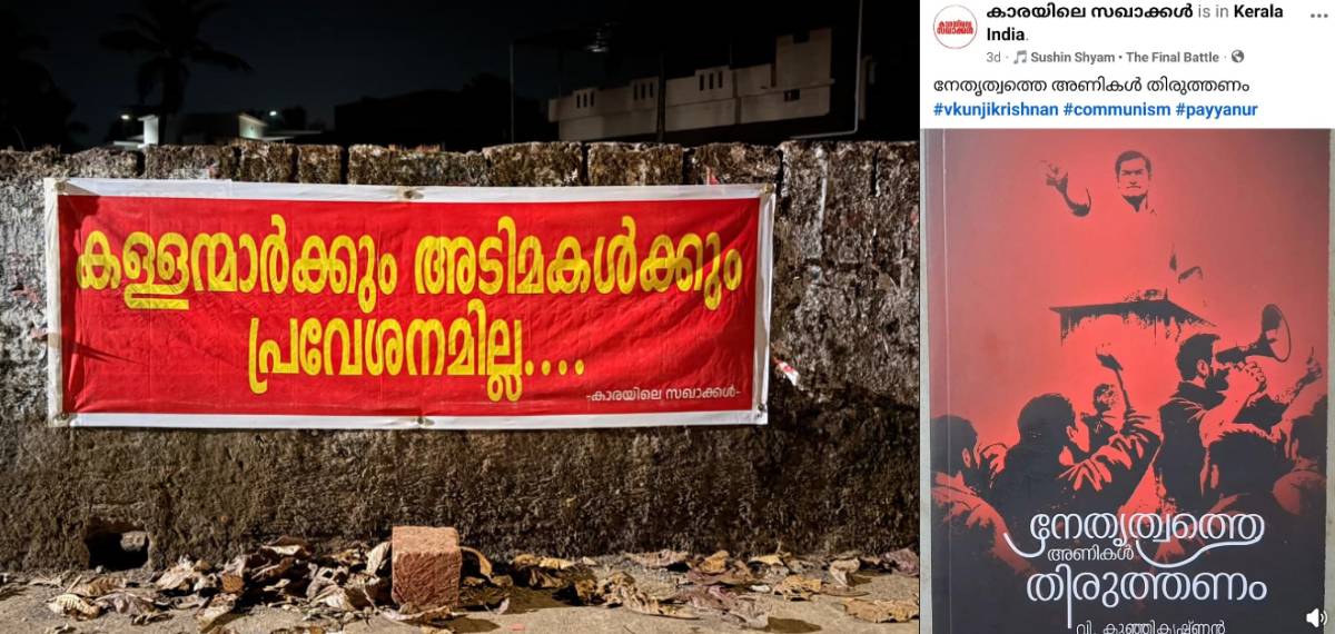 ‘കാരയിലെ സഖാക്കള്‍’ എന്ന പേരിലാണ് ബോര്‍ഡുകള്‍ സ്ഥാപിച്ചിരിക്കുന്നത്. കളളന്മാര്‍ക്കും അടിമകള്‍ക്കും പ്രവേശനമില്ല എന്നാണ് ഫ്‌ളക്‌സ് ബോര്‍ഡില്‍ എഴുതിയിരിക്കുന്നത്. കാരയിലെ സഖാക്കള്‍ എന്ന പേരിലുളള സമൂഹമാധ്യമ അക്കൗണ്ടുകളിലും വി കുഞ്ഞികൃഷ്ണനെ അനുകൂലിച്ച് പോസ്റ്ററുകളുണ്ട്.