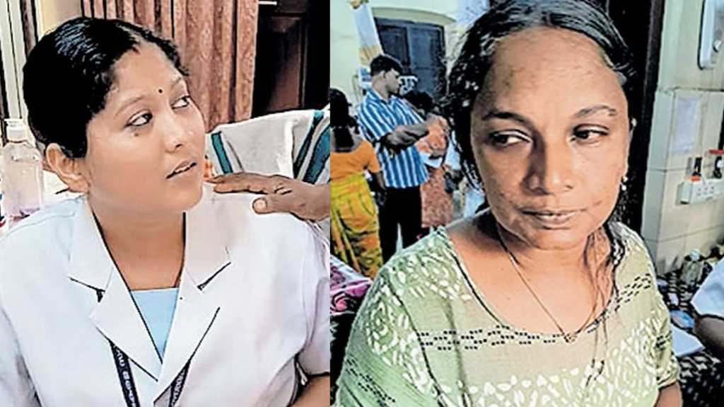 ഹിൽപാലസ് സ്റ്റേഷനിലെ സിപിഒ എൻ കെ റെജിമോൾ (42), താലൂക്ക് ആശുപത്രി നഴ്സിങ് ഓഫിസർ ജി ദിവ്യ (35) എന്നിവർക്കാണു മർദനമേറ്റത്. ഇന്നലെ വൈകുന്നേരം 5.30ന് കിഴക്കേക്കോട്ട ബസ് സ്റ്റോപ്പിന് സമീപമുള്ള ഷോപ്പിങ് കോംപ്ലക്സിൽ വെച്ചായിരുന്നു ആദ്യ സംഭവം. മദ്യപിച്ച് വെളിവില്ലാതെ അസഭ്യം പറഞ്ഞു നടന്ന മാധവൻ ബസ് സ്റ്റോപ്പിന് സമീപം നിന്ന ഒരു പെൺകുട്ടിയെ ആക്രമിക്കുകയായിരുന്നുവെന്ന് റെജിമോൾ പറഞ്ഞു. ഷോപ്പിങ് കോംപ്ലക്സിലേക്ക് ഓടിക്കയറിയ പെൺകുട്ടിയെ പ്രതി കടന്നുപിടിക്കുകയും ചെയ്തു. ഇതിനിടെയാണ് ഡ്യൂട്ടി കഴിഞ്ഞ് വീട്ടിലേക്ക് പോകാൻ നിന്ന റെജിമോൾ സംഭവത്തിൽ ഇടപെട്ടത്. പെൺകുട്ടിയെ രക്ഷിക്കുന്നതിനിടെ പൊലീസ് ഉദ്യോഗസ്ഥനെ ഇയാൾ തള്ളിയിട്ട ശേഷം മർദ്ദിക്കുകയായിരുന്നു.
