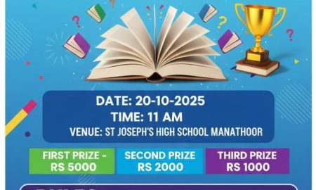 പാലാ: പിഴക് ജയ്ഹിന്ദ് ലൈബ്രറി ആൻഡ് റീഡിങ് റൂമിന്റെ ആഭിമുഖ്യത്തിൽ ഹൈസ്കൂൾ വിദ്യാർത്ഥികൾക്കായി അഖില കേരള ക്വിസ് മത്സരം നടത്തുന്നു. ഒരു സ്കൂളിൽ നിന്നും രണ്ട് വിദ്യാർഥികൾക്ക് മത്സരത്തിൽ പങ്കെടുക്കാവുന്നതാണ്....