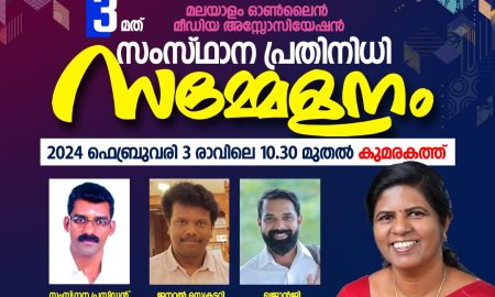 തിരുവനന്തപുരം :കേരളത്തിലെ പ്രമുഖ ഓൺലൈൻ മീഡിയ സംഘടനയായ മലയാളം ഓൺലൈൻ മീഡിയ അസോസിയേഷന്റെ മൂന്നാം സംസ്ഥാന സമ്മേളനം കുമരകത്ത് വച്ച് നടക്കും.കോട്ടയം ജില്ലാ പഞ്ചായത്ത് പ്രസിഡൻ്റ് കെ വി...