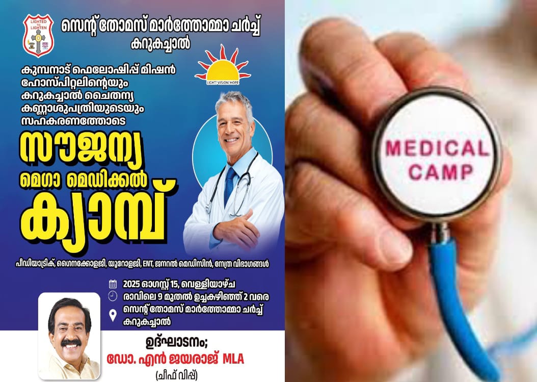 കറുകച്ചാല്: സെന്റ് തോമസ് മാര്ത്തോമ്മാ പള്ളിയുടെ ആഭിമുഖ്യത്തില് കുമ്പനാട് ഫെലോഷിപ്പ് മിഷന് ഹോസ്പിറ്റലിന്റെയും കറുകച്ചാല് ചൈതന്യ കണ്ണാശുപത്രിയുടെയും സഹകരണത്തോടെ സംഘടിപ്പിക്കുന്ന സൗജന്യ മെഗാ മെഡിക്കല് ക്യാമ്പ് 15 ന് നടക്കും.