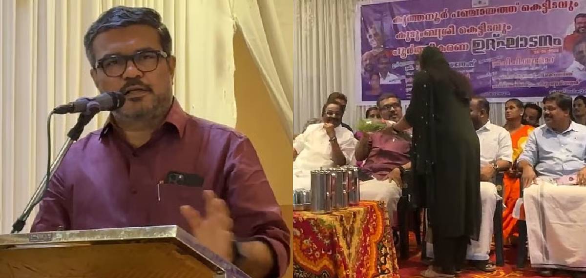 കോണ്ഗ്രസ് ഭരിക്കുന്ന കുത്തനൂർ പഞ്ചായത്തിന് കെട്ടിട ഉദ്ഘാടനത്തിനിടെയായിരുന്നു പ്ലാസ്റ്റിക് ബൊക്കെ നല്കിയത്.