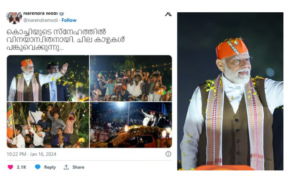 കൊച്ചിയിലെ റോഡ് ഷോയ്ക്ക് ശേഷം എക്സിൽ കുറിപ്പുമായി പ്രധാനമന്ത്രി നരേന്ദ്രമോദി. ‘കൊച്ചിയുടെ സ്നേഹത്തിൽ വിനയാന്വിതനായി. ചില കാഴ്ചകൾ പങ്കുവയ്ക്കുന്നു’, എന്നായിരുന്നു എക്സിൽ മോദിയുടെ മലയാളത്തിലുള്ള കുറിപ്പ്.