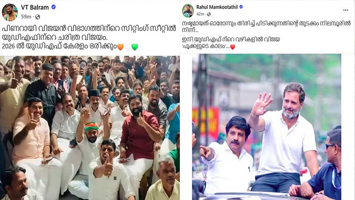 കോണ്ഗ്രസ് നേതാവ് വി ടി ബല്റാം ഉള്പ്പെടെയുള്ള നേതാക്കളാണ് വിജയം ഉറിപ്പിച്ചെന്ന നിലയില് സോഷ്യല് മീഡിയയില് പ്രതികരിച്ചിട്ടുള്ളത്. ”പിണറായി വിജയന് വിഭാഗത്തിന്റെ സിറ്റിങ് സീറ്റില് യുഡിഎഫിന്റെ ചരിത്ര വിജയം. 2026 ല് യുഡിഎഫ് കേരളം ഭരിക്കും”- എന്നാണ് വിടി ബല്റാമിന്റെ പോസ്റ്റ്. യുഡിഎഫ് ക്യാപിലെ ആഹ്ളാദത്തിന്റെ വീഡിയോ പങ്കുവച്ചാണ് മുന് എംഎല്എയുടെ പ്രതികരണം.
