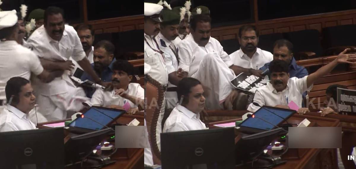 എംഎൽഎ അൻവർ സാദത്താണ് കാൽ ഉയർത്തി ഡയസിന് മുകളിലേക്ക് കയറാൻ ശ്രമിച്ചത്. അൻവർ സാദത്തിന് പുറമെ ടി വി ഇബ്രാഹീം, സനീഷ് കുമാർ ജോസഫ് എന്നിവരും ഡയസിലേക്ക് ചാടി കടക്കാൻ ശ്രമിച്ചു. വാച്ച് ആൻഡ് വാർഡ് തടഞ്ഞതോടെ പ്രതിപക്ഷ അംഗങ്ങൾ തിരികെ സീറ്റുകളിലേക്ക് മടങ്ങി.