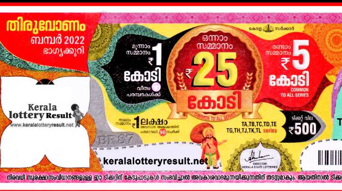 തിരുവോണം ബമ്പർ നറുക്കെടുത്തു. TG 434222 നമ്പറിനാണ് 25കോടി രൂപ സമ്മാനം.25 കോടി രൂപയുടെ ഒന്നാം സമ്മാനം, 1 കോടി രൂപ വീതം 20 പേർക്ക് രണ്ടാം സമ്മാനം അടക്കം ആകർഷകമായ സമ്മാനങ്ങളാണ് ഇത്തവണയും ഭാഗ്യശാലികളെ കാത്തിരിക്കുന്നത്.
