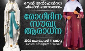 ഭരണങ്ങാനം: വി. അൽഫോൻസാ തീർത്ഥാടന കേന്ദ്രത്തിൽ ഫെബ്രുവരി 11 ചൊവ്വാഴ്ച രോഗീദിനമായി ആചരിക്കുന്നു. ലൂർദ്ദ്മാതാവിന്റെ തിരുനാൾ കൂടിയാണ് നാളെ. ലൂർദ്ദിൽ പരിശുദ്ധ മാതാവ് 1958-ൽ ആദ്യം പ്രത്യക്ഷപ്പെട്ടത് ഫെബ്രുവരി 11-നാണ്....