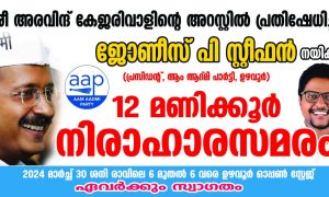 രാജ്യത്തെ ജനകീയനായ മുഖ്യമന്ത്രി അരവിന്ദ് കേജരിവാളിന്റെ അന്യായമായ അറസ്റ്റിൽ പ്രതിഷേധിച്ചു ഉഴവൂർ പഞ്ചായത്ത് ആം ആദ്മി പാർട്ടി പ്രസിഡന്റ് ജോണിസ് പി സ്റ്റീഫൻ ന്റെ നേതൃത്വത്തിൽ 12 മണിക്കൂർ നിരാഹാരസമരം....
