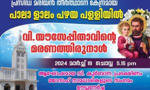 പാലാ: പ്രസിദ്ധ തീർത്ഥാടന കേന്ദ്രമായ പാലാ ളാലം പഴയ പള്ളിയിൽ വിശുദ്ധ യൗസേപ്പിതാവിന്റെ മരണത്തിരുനാൾ മാർച്ച് 19 ചൊവ്വാഴ്ച ഭക്തിനിർഭരമായി ആഘോഷിക്കുന്നു. അന്നേ ദിവസം വൈകുന്നേരം 4.30ന് ചെണ്ടമേളം...