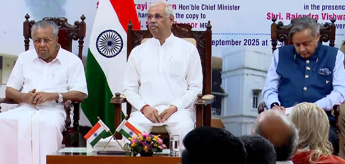 രാജ്ഭവൻ പ്രസിദ്ധീകരിക്കുന്ന ത്രൈമാസികയായ ‘രാജ്ഹംസി’ന്റെ പ്രകാശനചടങ്ങിൽ പങ്കെടുക്കാനാണ് മുഖ്യമന്ത്രി എത്തിയത്. ഗവര്ണര് രാജേന്ദ്ര ആര്ലേക്കറിന്റെ സാന്നിധ്യത്തില് ശശി തരൂർ എംപിക്ക് മാസിക നൽകിയാണ് പ്രകാശനം നിർവഹിച്ചത്.