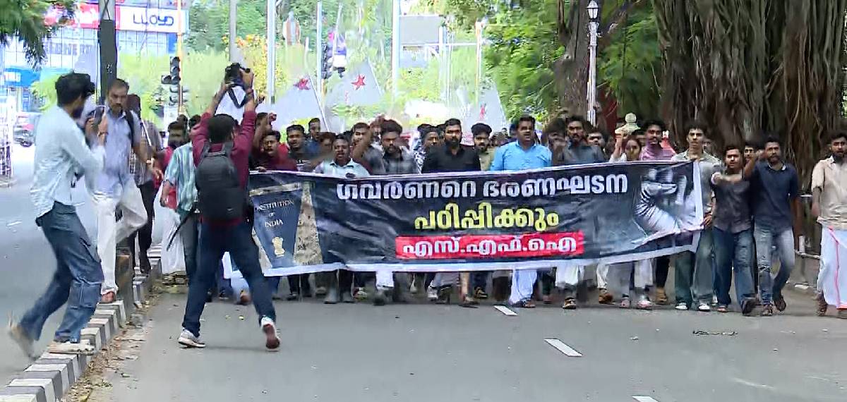 പിന്നാലെ പൊലീസ് ജലപീരങ്കി പ്രയോഗിച്ചാണ് പ്രവർത്തകരെ അവിടെ നിന്ന് മാറ്റിയത്. ഭരണഘടനയുടെ താളുകൾ ഗവർണറെ പഠിപ്പിക്കുമെന്ന് പ്രതിഷേധക്കാരും പറഞ്ഞു.