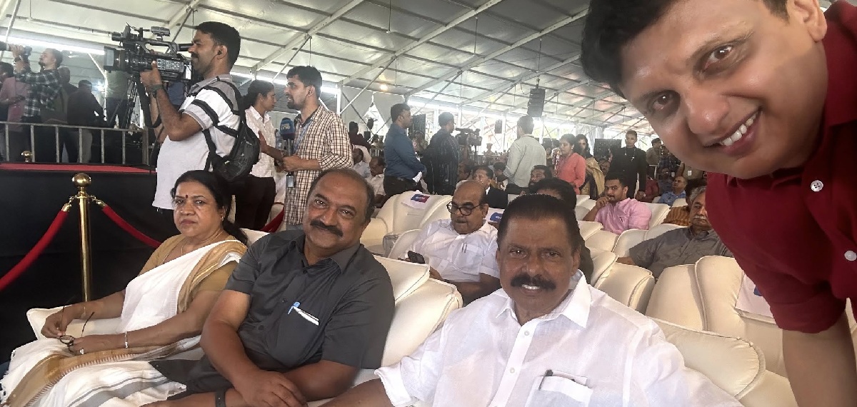‘ഞങ്ങൾ സദസ്സിലുണ്ട്, രാജീവ് ചന്ദ്രശേഖർ വേദിയിലും’ എന്ന അടികുറിപ്പോടെ എം വി ഗോവിന്ദനും, കെ എൻ ബാലഗോപാലിനും പിണറായി വിജയന്റെ ഭാര്യ കമല വിജയനൊപ്പവും ഇരിക്കുന്ന ചിത്രമാണ് മുഹമ്മദ് റിയാസ് പങ്കുവെച്ചത്.