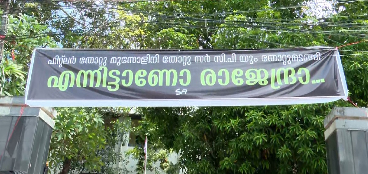 ‘ഹിറ്റ്ലർ തോറ്റു, മുസോളിനി തോറ്റു, സാർ സി പിയും തോറ്റുമടങ്ങി. എന്നിട്ടാണോ രാജേന്ദ്രാ’ എന്നാണ് ബാനർ. നേരത്തെ തിരുവനന്തപുരം സംസ്കൃത കോളേജിലും എസ്എഫ്ഐ ബാനർ കെട്ടിയിരുന്നു. ആർഎസ്എസിന്റെ തറവാട്ട് സ്വത്തല്ല രാജ്ഭവൻ എന്നാണ് ബാനറിൽ ഉണ്ടായിരുന്നത്.