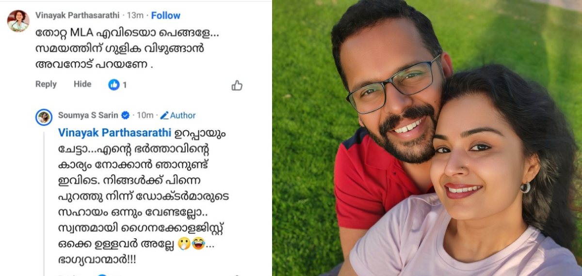 ‘തോറ്റ എംഎൽഎ എവിടെയാ പെങ്ങളേ, സമയത്തിന് ഗുളിക വിഴുങ്ങാൻ അവനോട് പറയണേ’ എന്ന കമന്റ് പങ്കുവെച്ചുകൊണ്ടാണ് സൗമ്യയുടെ കുറിപ്പ്.