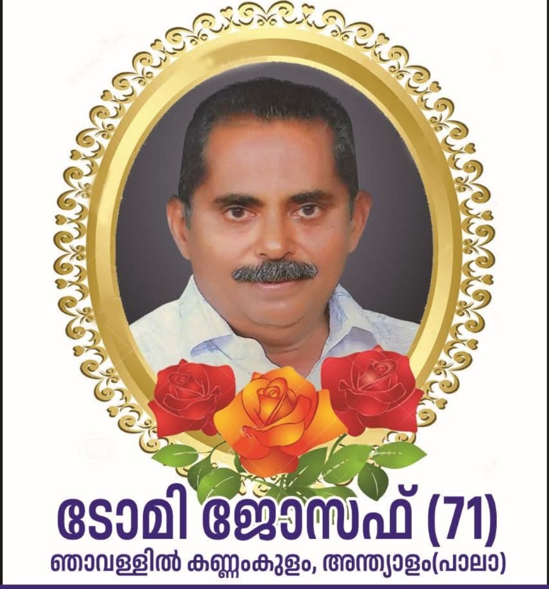 പാലാ :ടോമി ജോസഫ് ഞാവള്ളിൽ കണ്ണംകുളം നിര്യാതനായി .സംസ്ക്കാരം 25 .4 .2025 വെള്ളി 11 മണിക്ക് വീട്ടിൽ ആരംഭിച്ചു അന്ത്യാളം സെന്റ് മാത്യൂസ് പള്ളിയിൽ.ഭൗതീക ശരീരം വ്യാഴാഴ്ച വൈകിട്ട് നാലിന് ഭവനത്തിൽ കൊണ്ട് വരുന്നതാണ് .