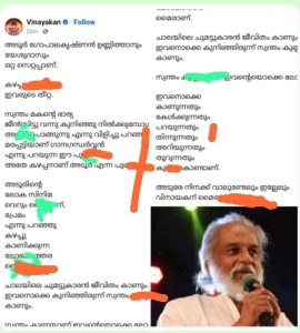 സംവിധായകൻ അടൂർ ഗോപാലകൃഷ്ണനും ഗായകൻ കെ.ജെ. യേശുദാസിനുമെതിരെ അധിക്ഷേപ പരാമർശവുമായി നടൻ വിനായകൻ. ഫെയ്സ്ബുക്ക് പോസ്റ്റില് ഇരുവരുടേയും പേര് എടുത്ത് പറഞ്ഞുകൊണ്ടാണ് നടന്റെ അധിക്ഷേപം. യേശുദാസിന്റെ ചിത്രവും പങ്കുവെച്ചിട്ടുണ്ട്.