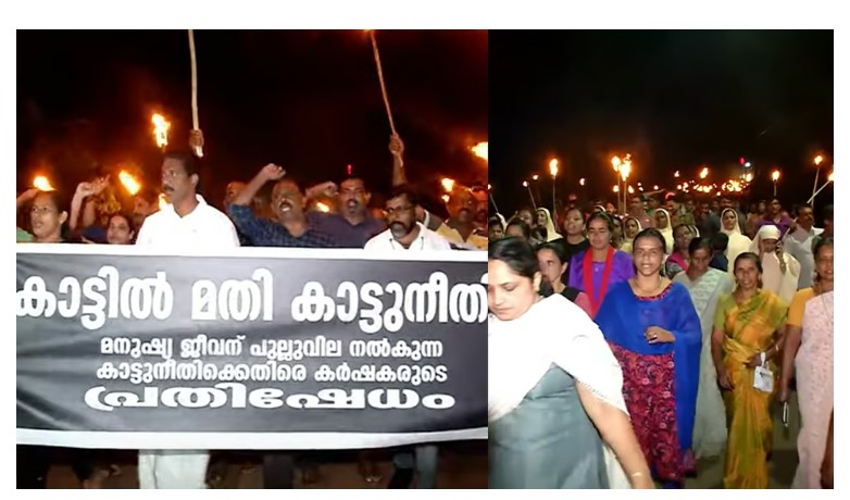പന്തം കൊളുത്തിയായിരുന്നു പ്രതിഷേധം. സ്ത്രീകളും കുട്ടികളും ഉൾപ്പടെ നാട്ടുകാർ ഒന്നാകെ പ്രതിഷേധവുമായി രംഗത്തെത്തി. ‘കാട്ടിൽ മതി കാട്ടുനീതി. മനുഷ്യ ജീവന് പുല്ലുവില നൽകുന്ന കാട്ടുനീതിക്കെതിരേ കർഷകരുടെ പ്രതിഷേധം’ എന്ന ബാനർ ഉയർത്തിക്കൊണ്ടായിരുന്നു പ്രതിഷേധം. പ്രതിഷേധക്കാർ ട്രാക്ടറിൽ വാഴവച്ച് ‘കേരള വനം വകുപ്പ്’ എന്ന ബോർഡ് തൂക്കി.