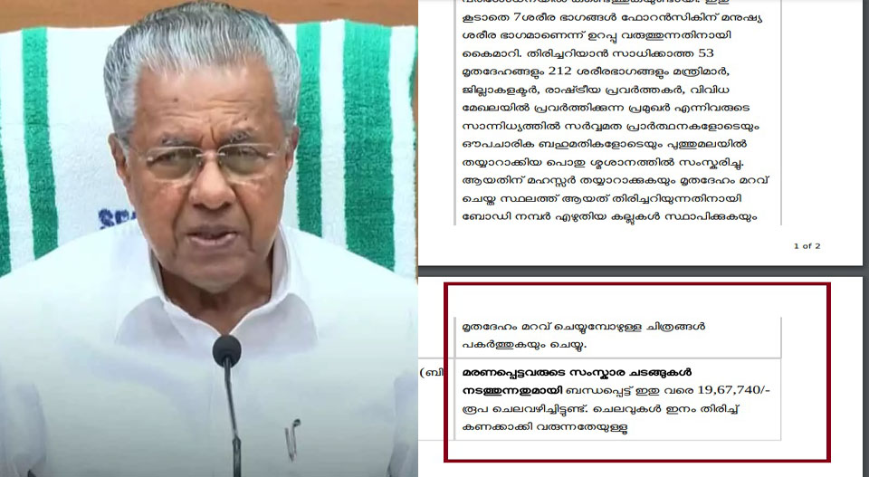 വയനാട് ദുരന്തത്തിൽ മരണപ്പെട്ടവരുടെ സംസ്കാരചടങ്ങുകൾ നടത്തിയതിന് 19,67,740 രൂപ ചെലവായെന്നാണ് മന്ത്രി കെ.രാജൻ നിയമസഭയിൽ പറഞ്ഞത്. 231 മൃതദേഹങ്ങൾ, 222 ശരീരഭാഗങ്ങൾ എന്നിവ കണ്ടെത്തി. ഇതിൽ 172 മൃതദേഹങ്ങളും രണ്ട് ശരീരഭാഗങ്ങളും നേരിൽ പരിശോധിച്ച് ബന്ധുക്കൾ തിരിച്ചറിയുകയും തിരിച്ചറിഞ്ഞ മൃതദേഹങ്ങൾ ബന്ധുക്കൾക്ക് കൈമാറുകയും ചെയ്തു. തിരിച്ചറിയാൻ സാധിക്കാത്ത 53 മൃതദേഹങ്ങളും 212 ശരീരഭാഗങ്ങളും സർവ്വത പ്രാർത്ഥനകളോടെയും ഔപചാരിക ബഹുമതികളോടെയും പുത്തുമലയിൽ തയ്യാറാക്കിയ പൊതു ശ്മാശാനത്തിൽ സംസ്കരിച്ചു. -മന്ത്രി വ്യക്തമാക്കി. അൻവർ സാദത്ത് എം എൽ എ യുടെ ചോദ്യത്തിനാണ് മറുപടി.