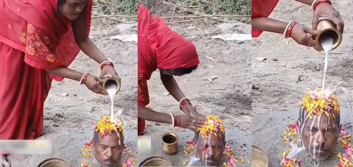ന്യൂഡൽഹി: സോഷ്യൽ മീഡിയയിൽ വൈറലായി, ഭർത്താവിനെ കഴുത്തുവരെ മണ്ണിൽ കുഴിച്ചിട്ടുള്ള ഭാര്യയുടെ പൂജ. ഭർത്താവിന്റെ ശരീരം കഴുത്തുവരെ മണ്ണിനടിയിൽ കുഴിച്ചിട്ട് തലയിൽ പാൽ അഭിഷേകവും പൂജയും നടത്തുന്ന വീഡിയോയാണ് പുറത്തുവന്നത്. സമൂഹമാധ്യമത്തിൽ വ്യാപകമായി പ്രചരിച്ച വീഡിയോ എവിടെനിന്നുള്ളതാണെന്ന് വ്യക്തമല്ല.